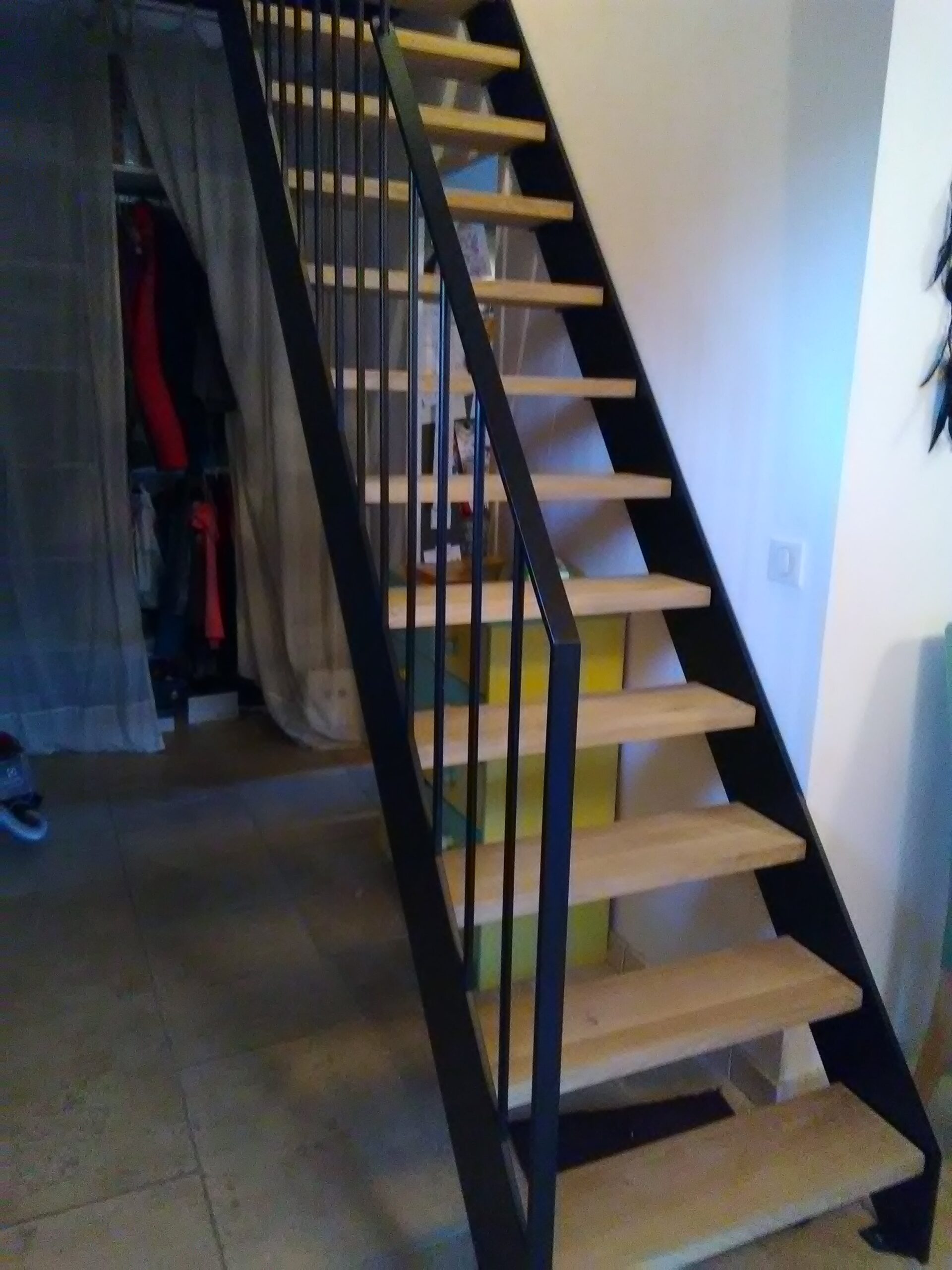 Dans le cadre de la rénovation de leur maison, les propriétaires m’ont sollicité en tant qu’artisan spécialiste de l’acier pour créer un petit escalier droit donnant accès à une chambre en mezzanine. Cet escalier droit et ouvert aux limons latéraux est parfaitement adaptable pour les petits espaces. Il laisse de la place pour des rangements supplémentaires sous l’escalier.