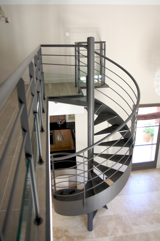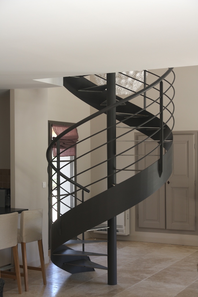 Les propriétaires d’une maison de particulier sur Lourmarin ont fait la demande d’un escalier colimaçon dans la pièce principale d’une maison neuve en construction. Malgré un bel espace disponible de la pièce de vie, le choix de créer un escalier sur-mesure en ferronnerie s’est porté sur la forme d’un escalier à forme hélicoïdale pour ne pas couper l’espace central. Le style contemporain de cet escalier colimaçon en acier est appuyé par les lisses horizontaux qui apportent de l’épaisseur et une touche résolument artistique à l’escalier. L’escalier débillardé et le garde corps offre un aspect visuel aérien, évoquant la fluidité d’une note de musique.