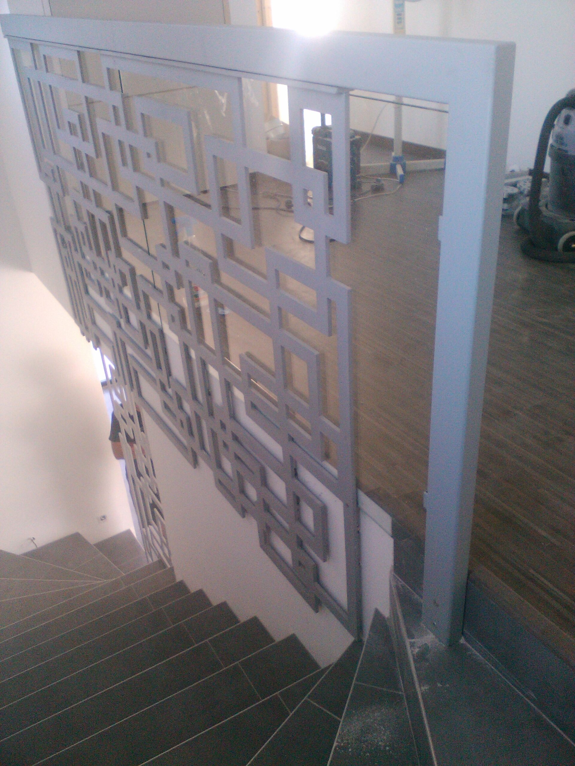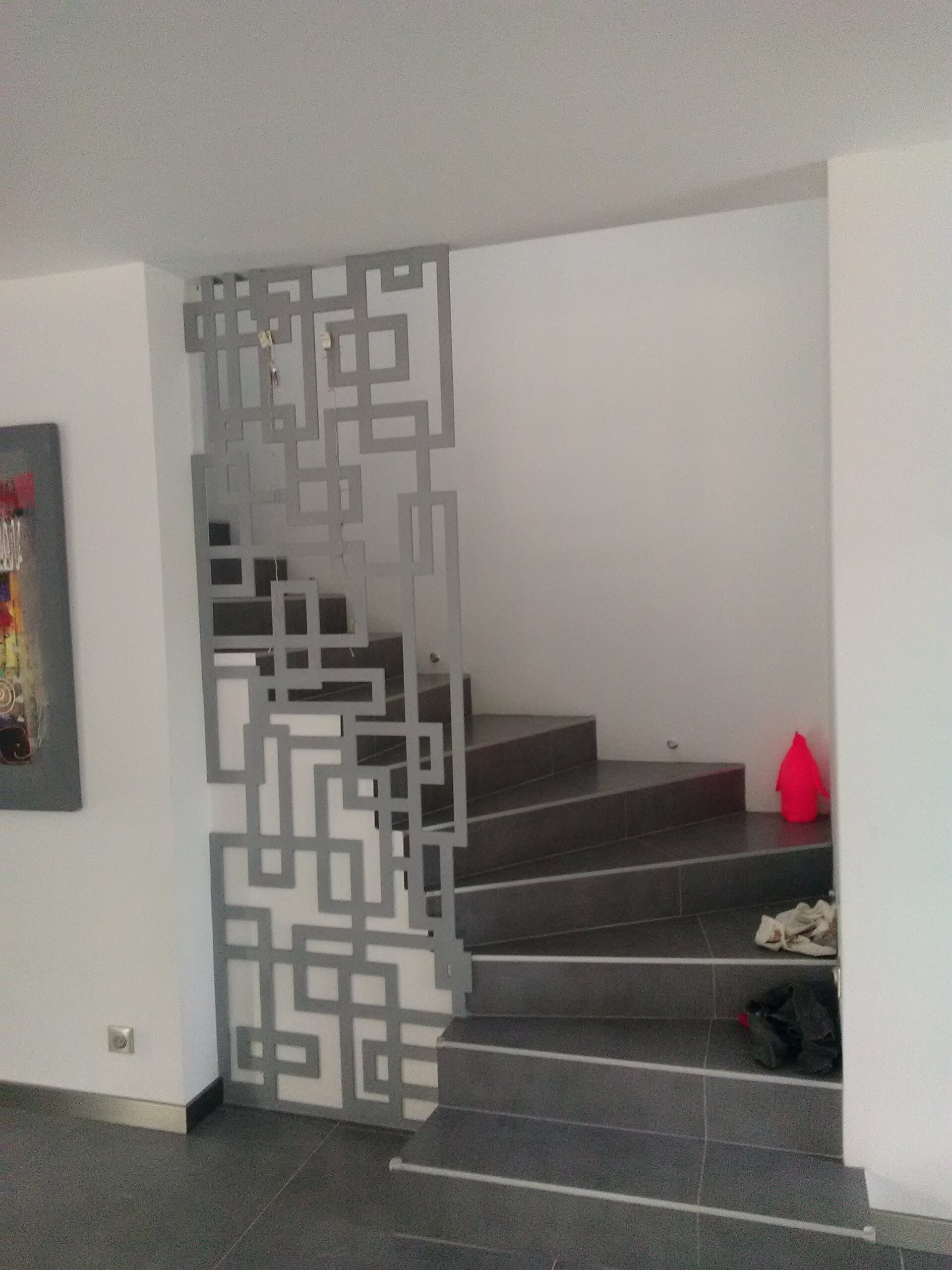 Pour la conception en métal au design original, j’ai travaillé une maille métallique découpée au laser avec un design original (validé au préalable par les clients) pour créer un structure à la fois protectrice et originale. Sa finition est thermolaquée, apportant une belle tenue dans le temps malgré des passages fréquents. Elle a été également doublée d’une plaque en verre pour laisser passer la lumière dans l’escalier tout en garantissant la sécurité des plus petits locataires de la maison.